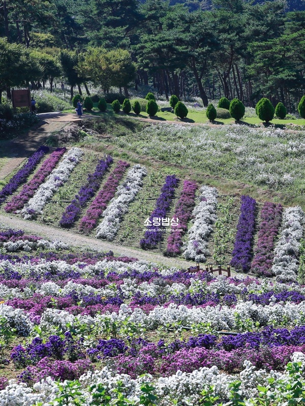 산 구비구비마다 구절초가 가득 피어 있는 모습은 정말 아름다웠어요. 하얀 구절초와 함께 아스타 국화도 있어서 더욱 좋았어요. 꽃들의 조화가 눈부셨습니다. 구절초가 이렇게 예쁜지 몰랐어요. 언덕 위쪽에는 하얀 구절초들이 무더기로 피어 있고, 둥근 보름달 조형물과 아이들 놀이터, 기차도 보여서 아이들도 즐겁게 놀 수 있답니다. 화장실 관리도 잘 되어 있고, 사람이 많이 붐비지 않아서 여유롭게 즐길 수 있었어요.